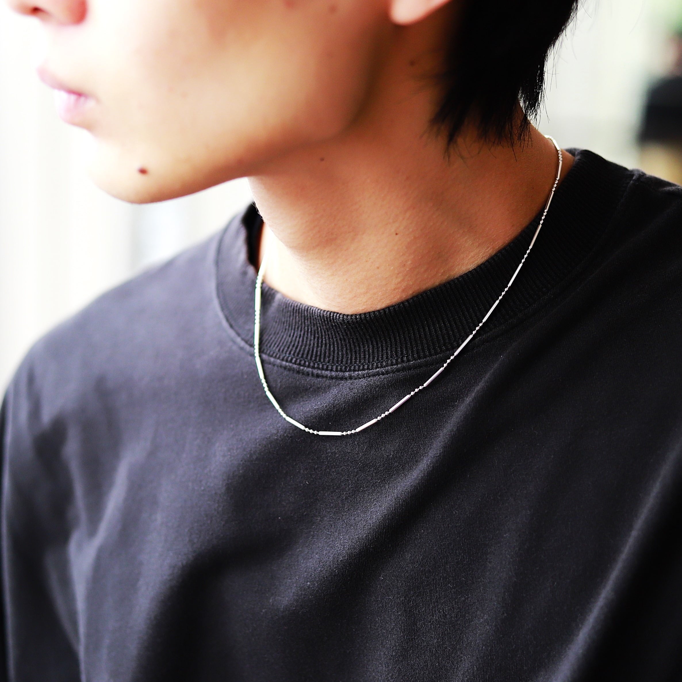 ■ 1.5mm幅の華奢な細長いチューブリンクが光を集め首元を軽やかにし普段のコーデをさりげなくおしゃれに