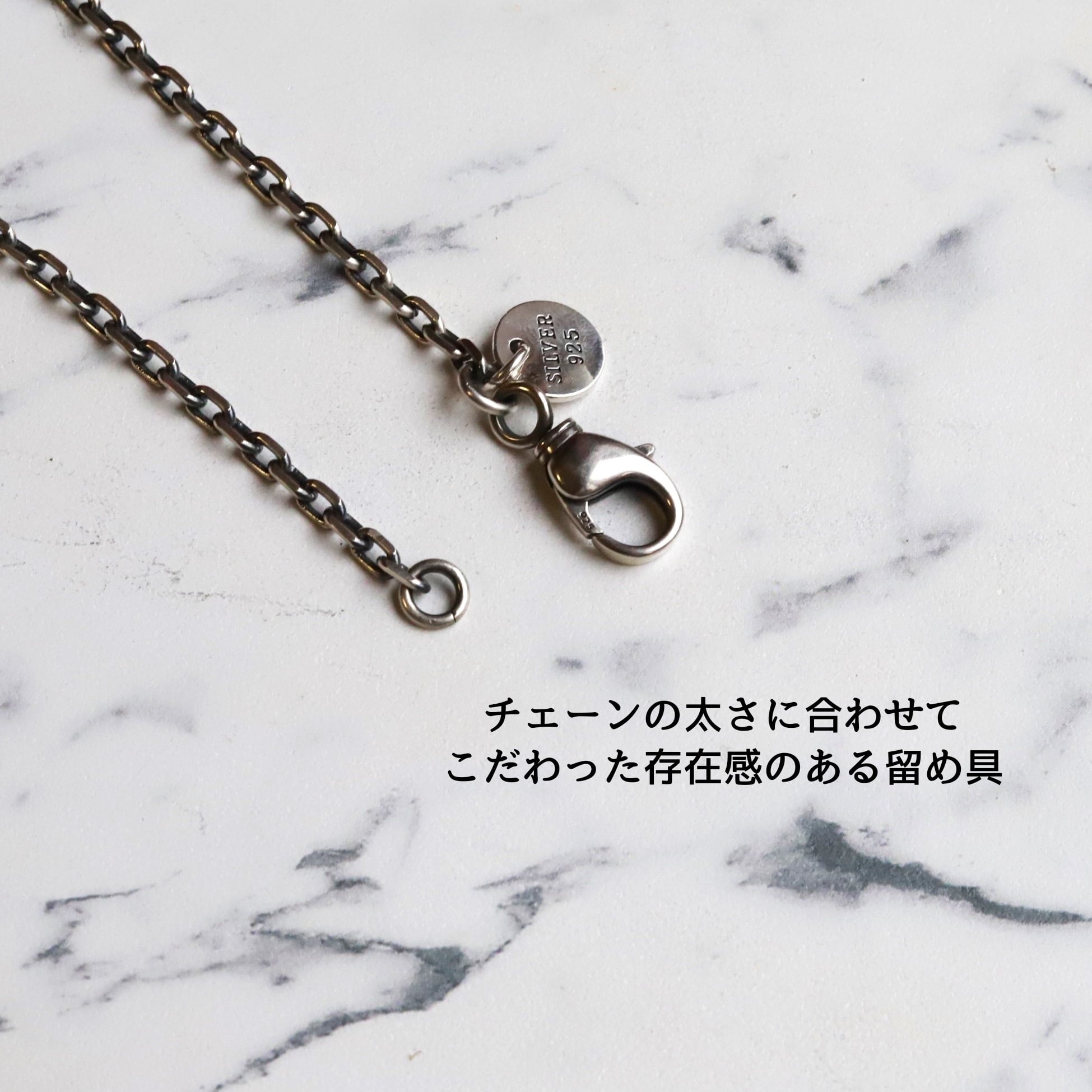 チェーンの太さのバランスを考えてカニカンタイプの留め具もエフドットジュエリーの中で一番大きなものを取り付けております。