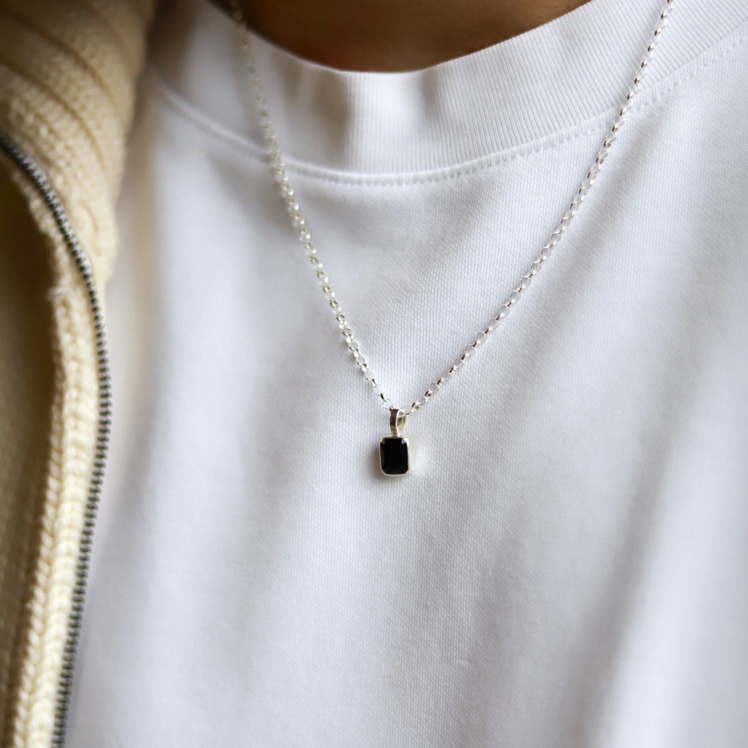 ■ 小さめなレクタングルの色石がかわいいネックレス。ブラックのシンプルなストーンはファッションに取り入れやすく毎日のコーディネートにも活躍。